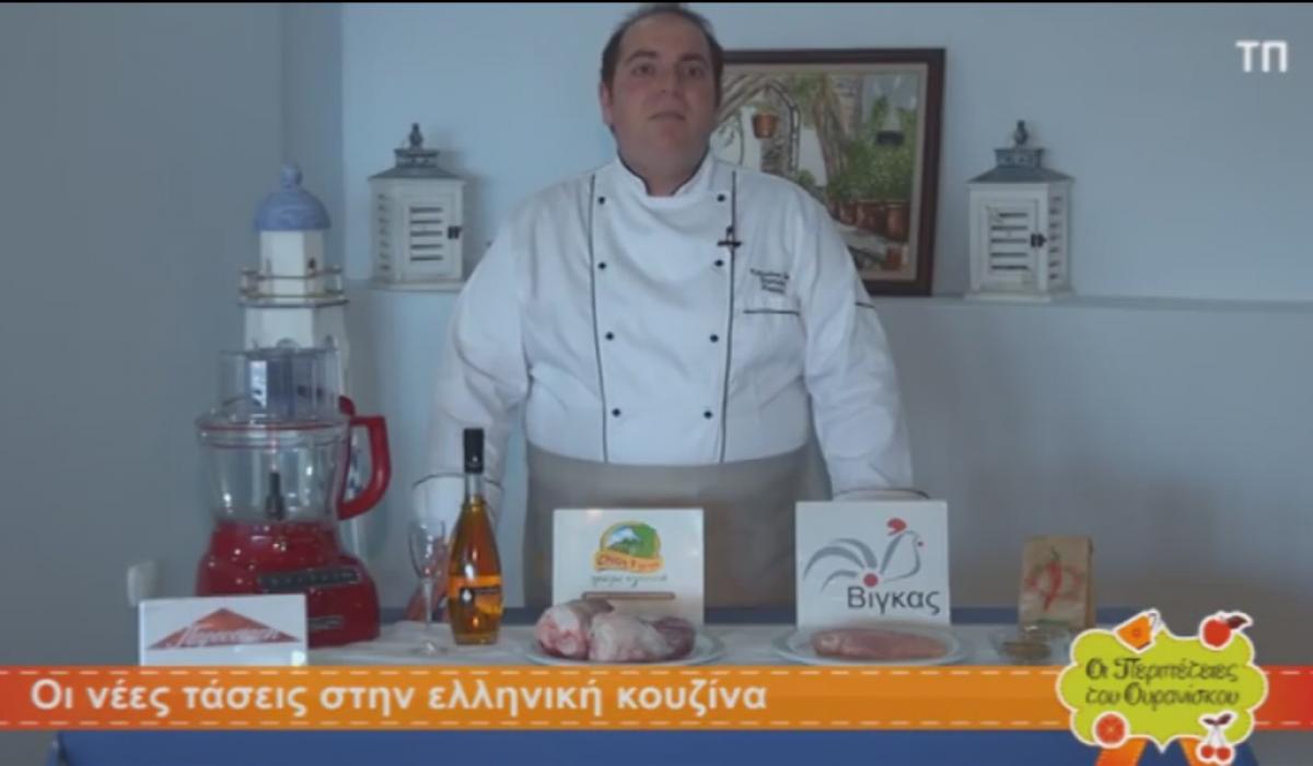 Στη σημερινή εκπομπή ο Σταμάτης μας ενημερώνει για τις νέες τάσεις στην ελληνική κουζίνα. Ξεκινάει το μενού με μία σαλάτα με κοτόπουλο και ψητά λαχανικά με λαδολέμονο και θυμάρι.Για κυρίως πιάτο θα μαγειρέψει με μοναδικό τρόπο το γνωστό χοιρινό κότσι αρωματισμένο στην λαδόκολλα και για γλυκό θα μας δείξει μία σπιτική τούρτα με μπισκότα τύπου ορέο και μπανάνες