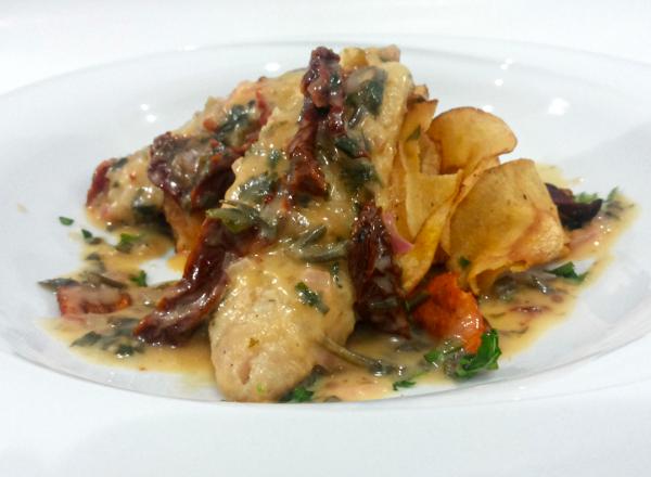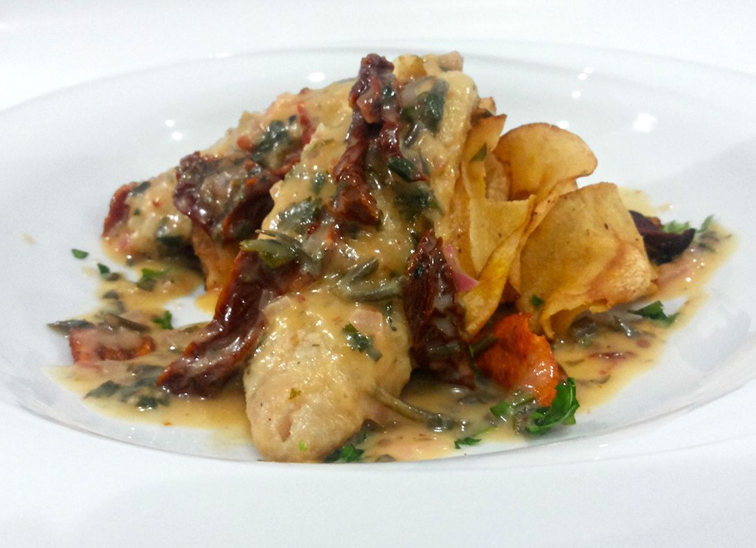 Φιλέτο μπαρμπουνιού με σαλάτα κάπαρης και λιαστής ντομάτας σερβιρισμένα επάνω σε τσιπς λαχ
