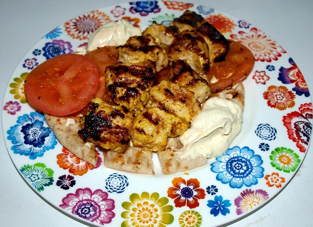 Σουβλάκια κοτόπουλο μαριναρισμένα με γιαούρτι και μπαχαρικά σερβιρισμένα επάνω σε πίττα με