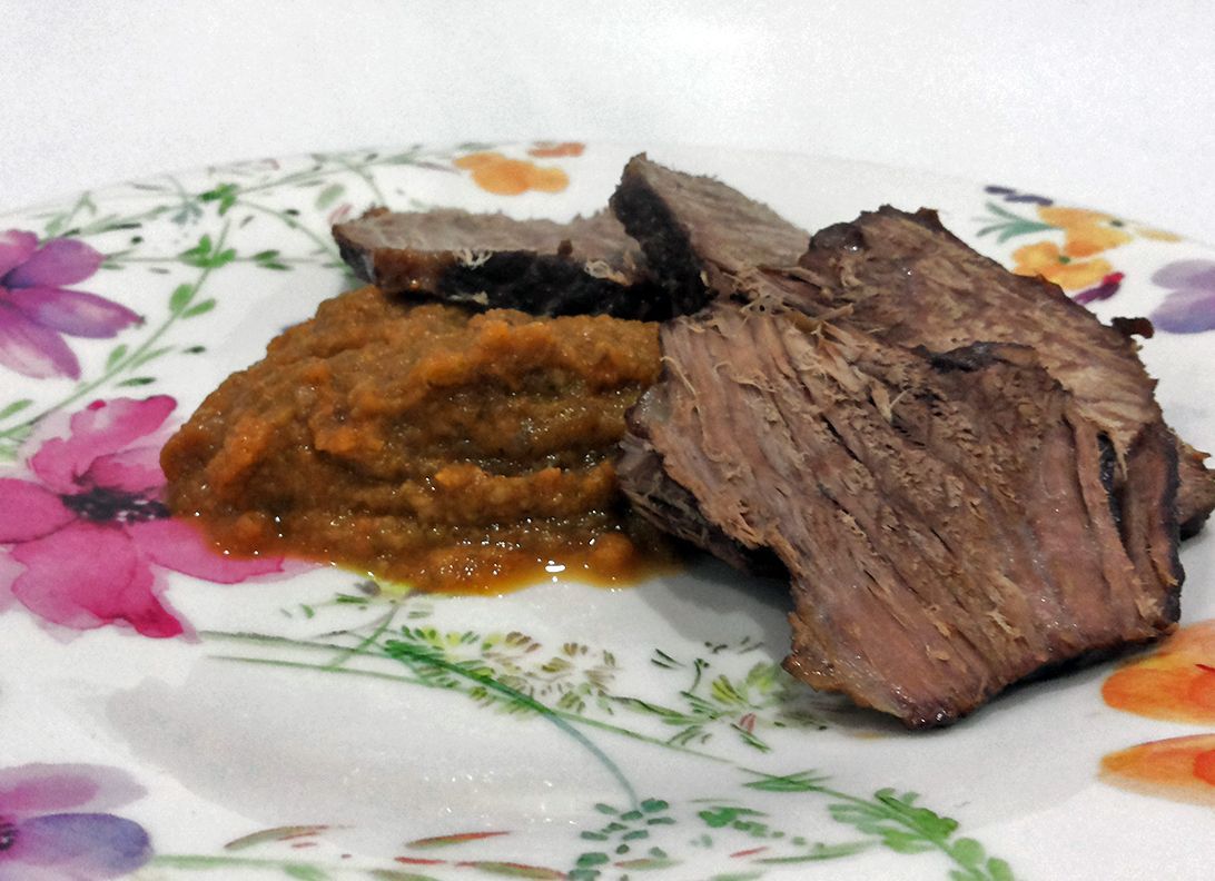 Νουά μοσχαρίσιο στη γάστρα με πουρέ λαχανικών