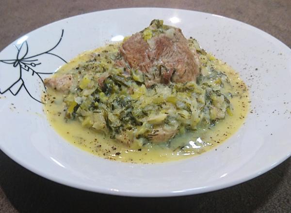 Χοιρινό πρασοσέλινο με αυγολέμονο, πράσινη σαλάτα με strips κοτόπουλου πανέ και τηγανιτά π