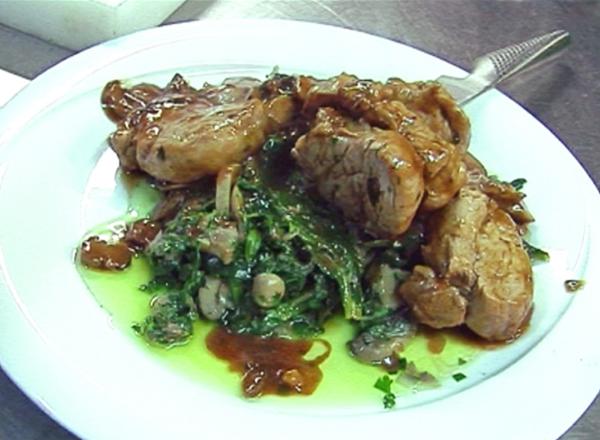 Φιλέτο χοιρινό ντυμένο με κρούστα πιπεριών σοτέ γαρνιρισμένο με μανιτάρια και σπανάκι