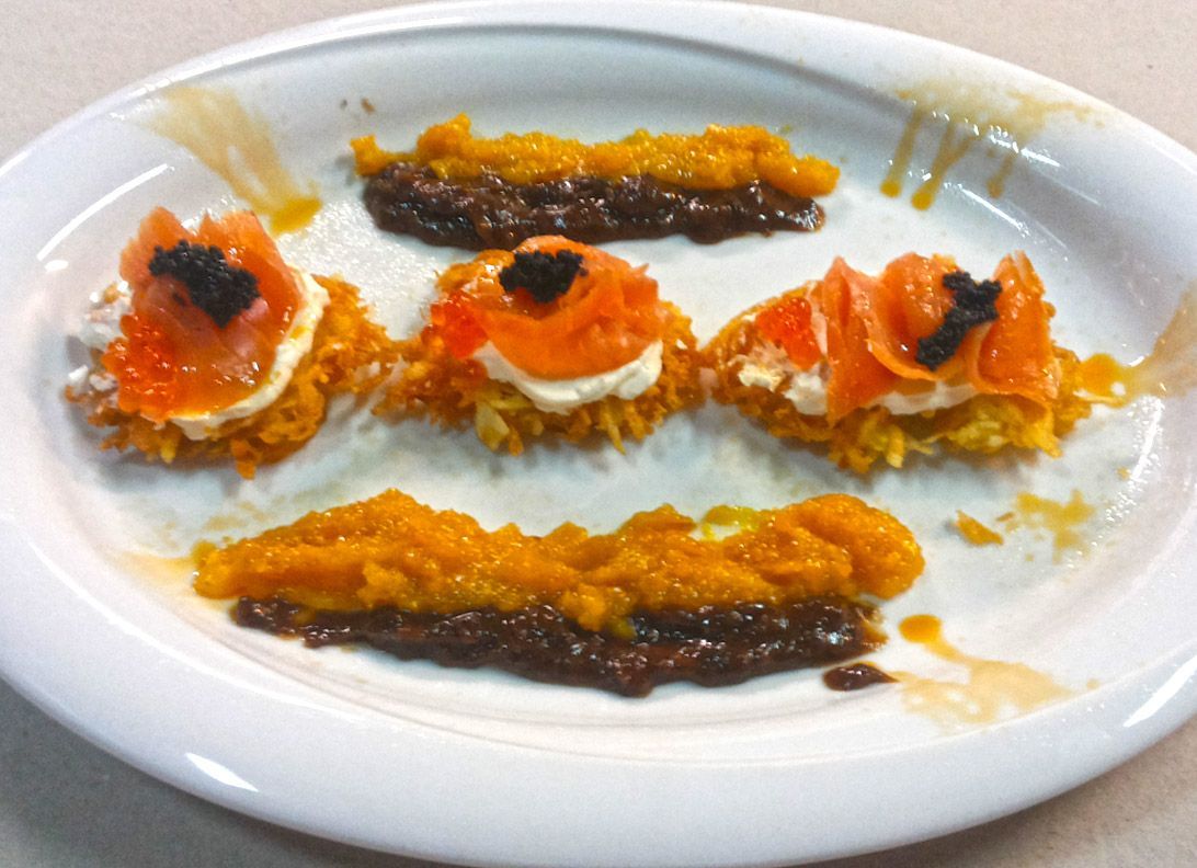 Σολομός καπνιστός σερβιρισμένος πάνω σε φρυτάτα πατάτας με τυρί Φιλαδέλφεια διακοσμήμενο μ