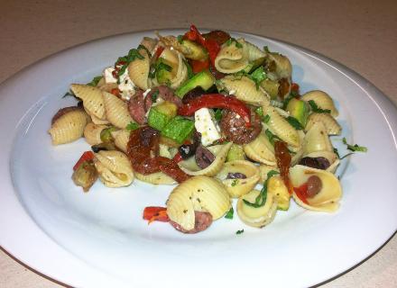 Βράζουμε τα ζυμαρικά μας σε αλατισμένο νερό. Σοτάρουμε το λουκάνικο που έχουμε κόψει σε μικρά κομμάτια, με λίγο ελαιόλαδο, για 5 περίπου λεπτά μέχρι να ροδίσει σε μέτρια - χαμηλή φωτιά.Κόβουμε τα κολοκύθια σε τετράγωνα ώστε να μοιάζουν με χοντρά ζάρια. Συνεχίζουμε με τις μελιτζάνες κόβοντάς τις στο ίδιο σχήμα. Μόλις τις κόψουμε, μπορούμε να τις βάλουμε σε νερό για να φύγει η καφεΐνη που έχουν στο φλοιό τους και να ξεπικρίσουν. Μόλις τα λουκάνικα είναι έτοιμα, τα τοποθετούμε με μια τρυπητή κουτάλα μέσα στη μπασίνα μας. Δυναμώνουμε τη φωτιά λίγο και στο ίδιο λάδι που σοτάραμε το λουκάνικο, ρίχνουμε τα κολοκυθάκια για 2-3 λεπτά, ώστε να μαλακώσουν αλλά να παραμείνουν τραγανά χωρίς να παραψηθούν. Μόλις είναι έτοιμα, τα βάζουμε με την τρυπητή κουτάλα και αυτά στη μπασίνα. Στο ίδιο λάδι σοτάρουμε και τις μελιτζάνες, αφού τις ξεπικρίσουμε. Τις σοτάρουμε για 2-3 λεπτά και τις τοποθετούμε και αυτές στη μπασίνα. Ανακατεύουμε για λίγο τα υλικά που βρίσκονται στη μπασίνα (λουκάνικο - κολοκύθι - μελιτζάνα), προσθέτουμε τα βρασμένα κοχυλάκια, συνεχίζουμε το ανακάτεμα, προσθέτουμε τις ελιές - ροδέλα, τις πιπεριές, τον βασιλικό, λίγο πιπέρι, λίγο αλάτι, τις λιαστές ντομάτες αφού τις κόψουμε σε μικρά κομμάτια, λίγο ελαιόλαδο, το ξύδι και τέλος τη φέτα κομμένη και αυτή σε μικρά κομμάτια. Ανακατεύουμε καλά όλα τα υλικά και η σαλάτα μας είναι έτοιμη.