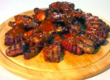 Μπάρμπεκιου με κοψίδια, λουκάνικα, κοτόπουλο, μπιφτέκι και φιλετάκι χοιρινό.