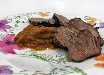 Νουά μοσχαρίσιο στη γάστρα με πουρέ λαχανικών