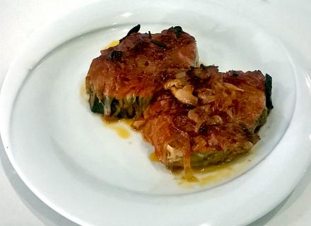Κόβουμε την παλαμίδα σε μουρέλα και αφαιρούμε το αίμα πλένοντας πολύ καλά. Την απλώνουμε σε ταψί και την αλατοπιπερώνουμε. Κάνουμε τη σύμβραση σοτάροντας το σκόρδο και το κρεμμύδι και μετά προσθέτουμε την ντομάτα. Αφήνουμε να βράσουν για λίγο και μετά περιχύνουμε το ψάρι. Τέλος το βάζουμε στο φούρνο στους 200οC για 40 λεπτά περίπου.
