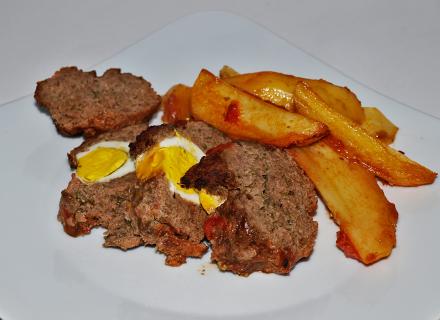Ρολό γεμιστό με αυγά με 2 είδη κιμά και ροδοκόκκινες πατάτες