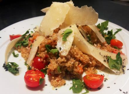 Σαλάτα με κινόα μαγειρεμένη μείγμα μινεστρονε σερβιρισμένη με παλαιωμένη βιολογική παρμεζάνα και ηλιόσπορους