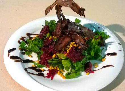 Σαλάτα με τραγανό παστουρμά και ψητό πατζάρι και καραμελώμενο μπαλσάμικο