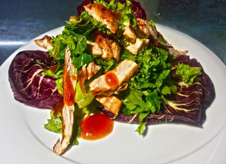 Σαλάτα με ψητό κοτόπουλο σερβιρισμένη με ροκά και ανάμεικτα μαρουλοειδή περιχυμένα με λαδολέμονο με τσαντευ βερίκοκο και τζίντζερ