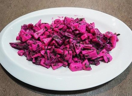 Στη συνέχεια ανακατεύουμε τα παντζάρια, το γιαούρτι, το μέλι, το σκόρδο, τα σχοινόπρασα και το μαστιχέλαιο σε ένα μέτριο μπολ. Για να σερβίρουμε τη σαλάτα, βάζουμε μερικές ροδέλες μαριναρισμένου πράσινου μήλου σε έναν ομόκεντρο κύκλο, στο κέντρο κάθε πιάτου. Βάζουμε από πάνω μια μεγάλη ποσότητα από την παντζαροσαλάτα. Περιχύνουμε με λίγο ακόμα ελαιόλαδο, εάν θέλουμε.