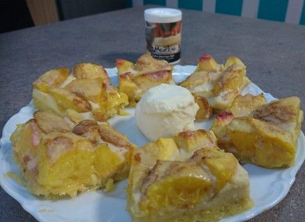 Εάν ψάχνεται ένα καλοκαιρινό γλυκό για να σας ενθουσιάσει τότε βρήκαμε το κατάλληλο για εσάς! Αρωματικό γλυκό ταψιού με ροδάκινα συνοδευμένο με δροσερό παγωτό!