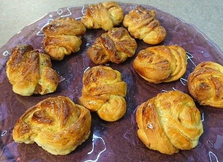Αλείφουμε με βούτυρο το κάθε τετράγωνο, πασπαλίζουμε με καννελοζάχαρη που στο μεταξύ έχουμε ανακατέψει και διπλώνουμε στα 3. Κόβουμε σε κάθετες λουρίδες τις οποίες δένουμε κόμπο και τοποθετούμε σε ταψάκια.