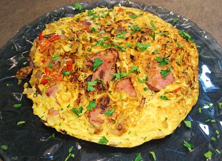 Προσθέτουμε το μείγμα των αβγών, ανακατεύουμε απαλά να αναμειχθούν τα υλικά και αφήνουμε την ομελέτα να ψηθεί για περίπου 4 - 5 λεπτά, μέχρι να ροδίσει η κάτω πλευρά. Καλύπτουμε το τηγάνι με ένα μεγάλο πιάτο ή με ένα επίπεδο καπάκι, το γυρίζουμε ανάποδα και αδειάζουμε την ομελέτα ξανά στο τηγάνι με την άψητη πλευρά προς τα κάτω. Ψήνουμε για περίπου άλλα 3 - 4 λεπτά, μέχρι να χρυσίσει και αυτή η πλευρά. (Τη διαδικασία αυτή καλύτερα να την κάνουμε πάνω από το νεροχύτη, για να αποφύγουμε τυχόν ατυχήματα.)
