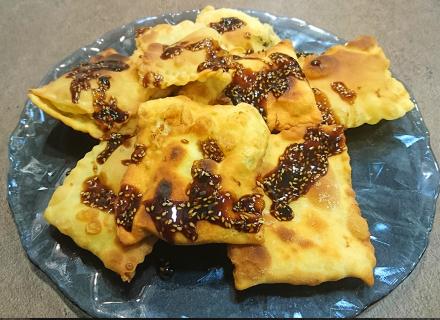 Αλευρώνουμε μια λεία επιφάνεια. Χωρίζουμε τη ζύμη σε 10 μέρη και ανοίγουμε το καθένα με τον πλάστη σε λεπτό φύλλο πάχους 2 χλστ. και διαστάσεων περίπου 30 x 30 εκ. Κόβουμε κάθε φύλλο σε 3 λωρίδες, η καθεμιά περίπου 10 x 30 εκ. Στην άκρη κάθε λωρίδας βάζουμε 1 γεμάτη κουταλιά σούπας από τη γέμιση και διπλώνουμε σε τρίγωνο.