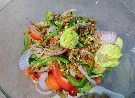 Τεμαχίζουμε το μαρούλι, το μανιτάρι , το κολοκυθάκι και το αγγούρι. Κόβουμε την πιπεριά σε λεπτά μπαστουνάκια και το καρότο σε ροδέλες και ψιλοκόβουμε το κρεμμύδι και το προσθέτουμε όπως και το κρεμμύδι. Τέλος, περιχύνουμε με την βινεγκρετ και ανακατεύουμε.